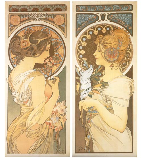 characterized actress Maude Adams as Joan of Arco.Mucha produced a large number of paintings, posters, advertisements and illustrations as well as designs for jewelry, carpets, wallpaper, and theater sets (lithographs) in what became known as the Art Nouveau style. Mucha's works frequently featured young women, healthy, beautiful, floating vaguely Neoclassical looking robes, often surrounded by lush flowers which sometimes formed haloes behind their heads. This style was often imitated. Anyway, Mucha attempted to distance itself from such a style throughout his life, insisting that rather than adhering to any fashionable stylistic form, his paintings originated in his own inspiration. He declared that art existed only to communicate a spiritual message and nothing else, hence his frustration at the fame he gained through commercial art. Therefore always wanted to concentrate on more lofty projects that would ennoble art and his birthplace. Many visited the United States between 1906 and 1910, then returned to Czech lands and settled in Prague, where he decorated the Theater of Fine Arts and other landmarks of the city.